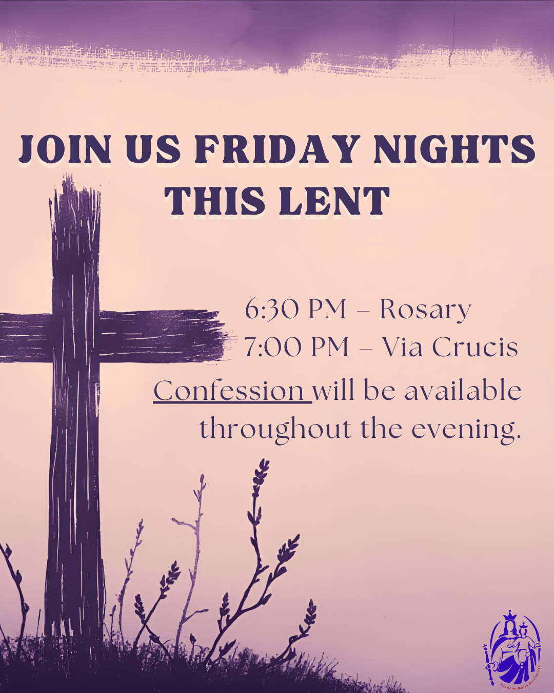 Rosary, Via Crucis, and confession available throughout the evening. ✨✝️